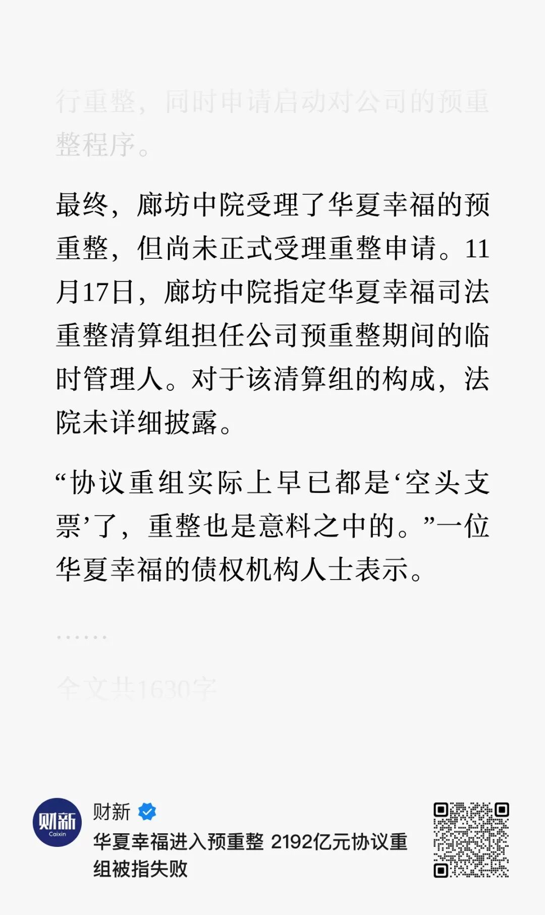 所以,他就向河北省廊坊市中级人民法院申请启动华夏幸福重整及预重整程序,目前法院已受理。