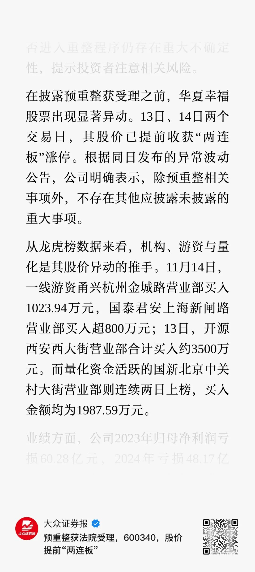 《大众证券报》报道,机构、游资与量化是华夏幸福公告前股价异动的推手:
