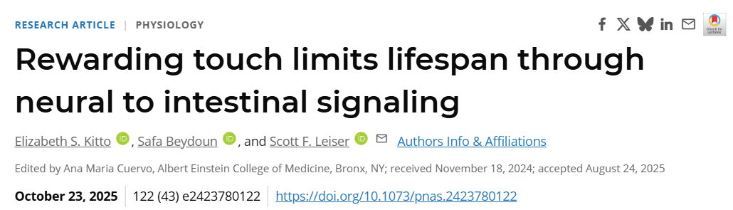 [1] Kitto, E. S., Beydoun, S., & Leiser, S. F. (2025). Rewarding touch limits lifespan through neural to intestinal signaling. Proceedings of the National Academy of Sciences, 122(43), e2423780122. https://doi.org/10.1073/pnas.2423780122