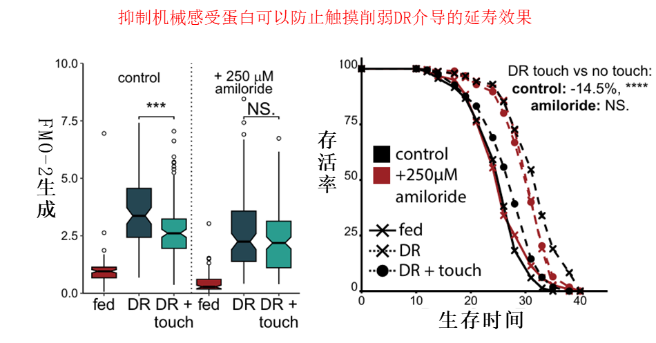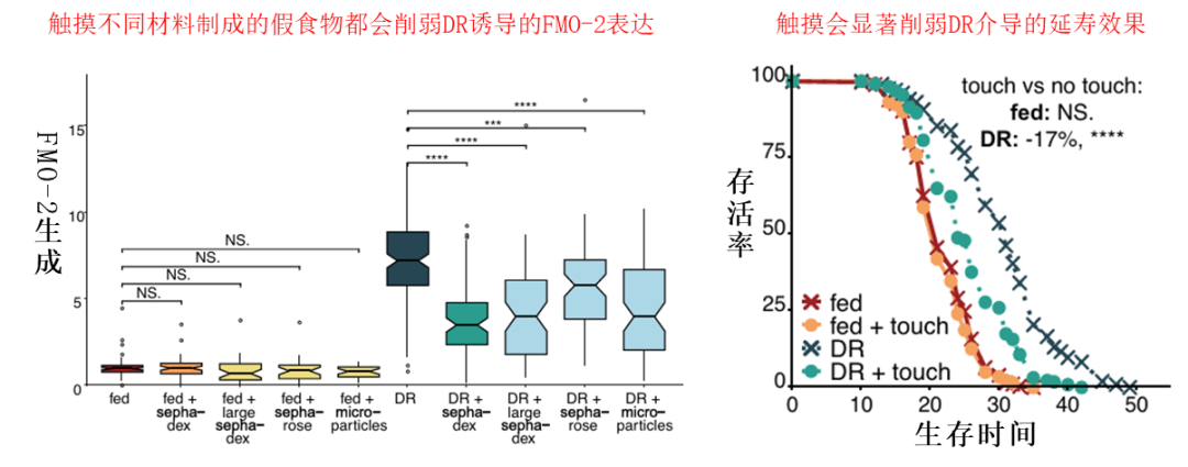 图注:触摸假食物会削弱肠道FMO-2的表达和DR状态下的寿命延长