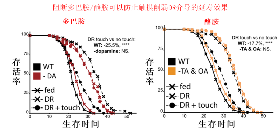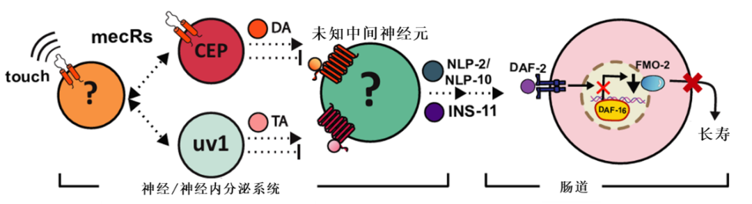 机械感受器发送的错误警报到达大脑后,大脑开始释放多巴胺(愉悦奖励信号)、酪胺(应激调节信使),进而触发INS-11和NLP-2等神经肽的分泌,把“食物充足”这个假情报传至全身各处,让大脑误认为无需启动长寿程序。