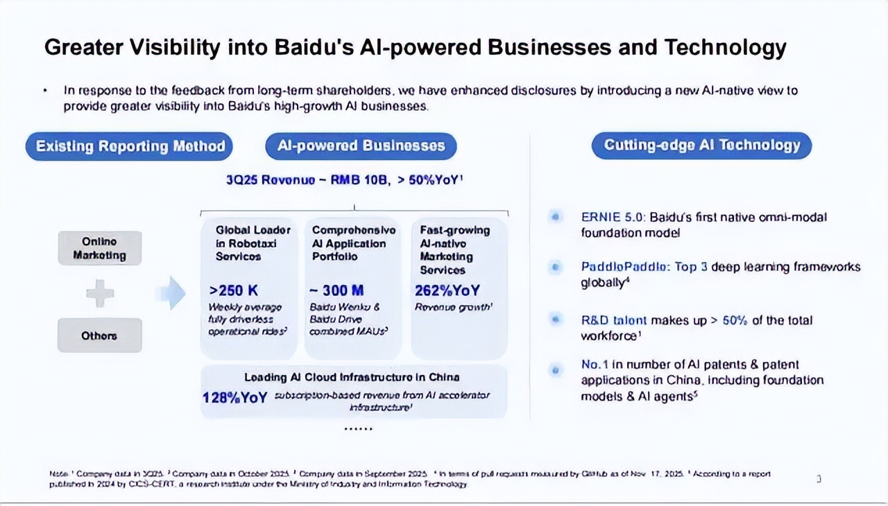 于百度而言,变革的价值,不仅在于财务上的增长,更在于在AI领域持续千亿投入有了阶段性的成果。
