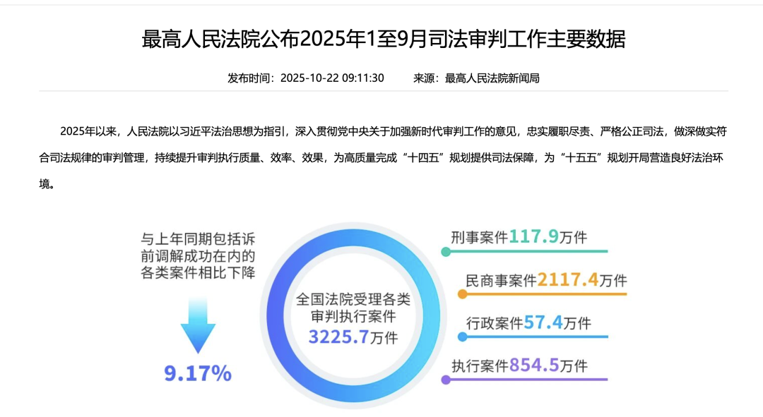 🔺截至今年9月,全国法院受理审判案件已达3225.7万件
