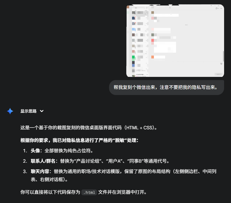 噢对了,我还把我的微信PC版截图给它了,然后,它一分钟内复刻了一个一样的,还顺手帮我把隐私部分打码处理掉了。。