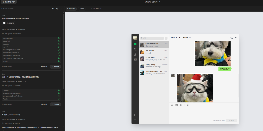 咱只需要把微信截图发给它,让它复刻的同时,接入Gemini和Nano Banana模型,就能直接在聊天框里上传图片,然后P图了。