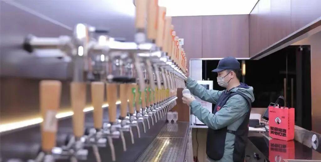 在灯光明亮、装修简约的打酒铺内,店员站在一排金属酒头前,熟练地为客人打上一杯按“两”售卖的鲜啤、果酒或白酒。没有最低消费,也没有酒吧震耳的音乐,顾客通常即打即走,或者和朋友在吧台边小坐片刻,配上一把花生米或从隔壁小店买来的卤味小吃,享受一段微醺“时刻”。
