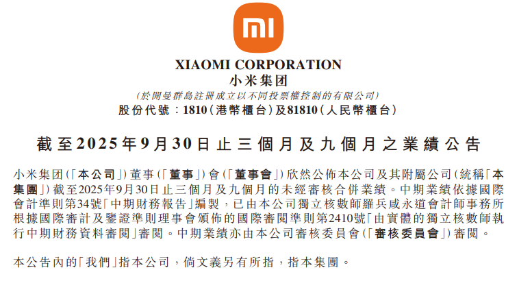 小米2025年第三季度财报