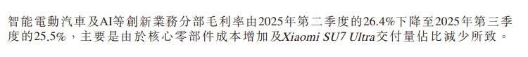 而且由于SU7 Ultra作为偏小众车型,部件成本增加和 SU7 Ultra交付量占比的减少,小米的汽车业务毛利环比反而是在降低的。
