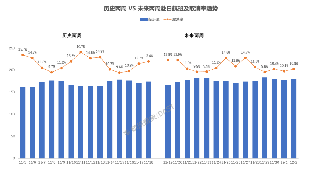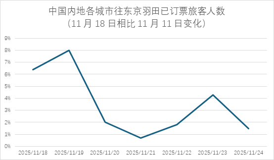 航班管家DAST监测数据显示,中国大陆赴日民航客座率出现明显下滑。11月18日客座率预计环比上周下降12.3个百分点,旅客量预计下降10.8%。尽管截至11月19日尚未出现航班大面积取消,但11月18日航班取消率达13.4%,为近五日最高。