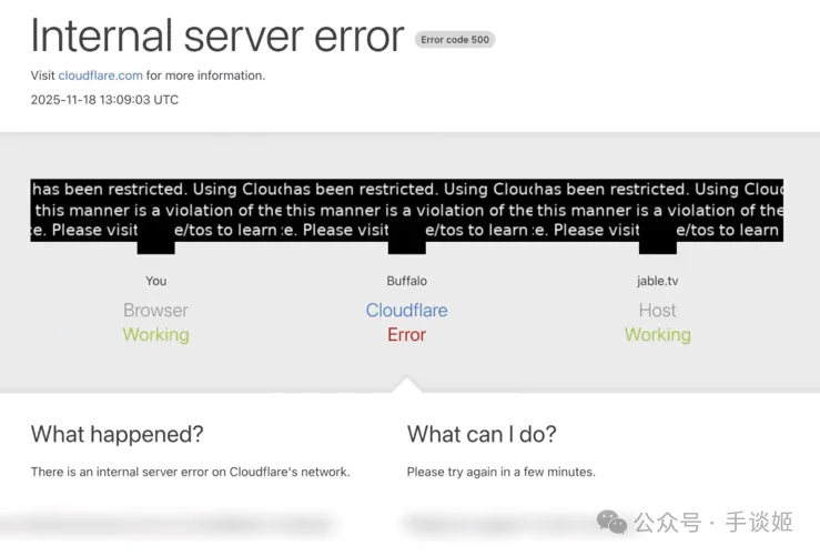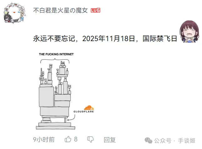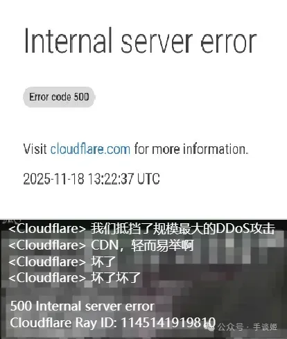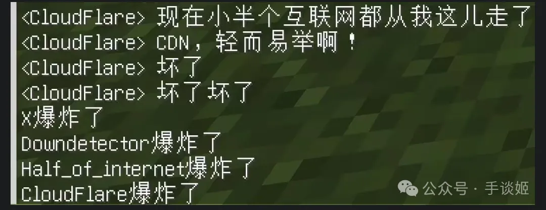 姬查了一下才发现,是Cloudflare(科赋锐)出了问题。不过国内的网站游戏基本上就没有受影响,甚至有人在群里讨论科赋锐炸了,大喊自己坠机了的时候,有人在群里问——CF(Cloudflare缩写)是啥?穿越火线?为啥穿越火线会影响到这么多人啊?