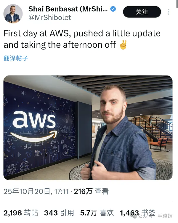 “入职 AWS 第一天,推送了一个小更新,下午休息一下✌️”