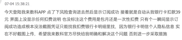 另一名用户反映,“今天登录我来数科APP,点了下风险查询进去,然后显示订阅成功,接着就是自动从我银行卡扣款39元,界面上没显示任何扣费说明,也没标注这个费用是包月还是一次性扣费,只有个一瞬间显示订阅成功,造成根本没法截图凭证。”