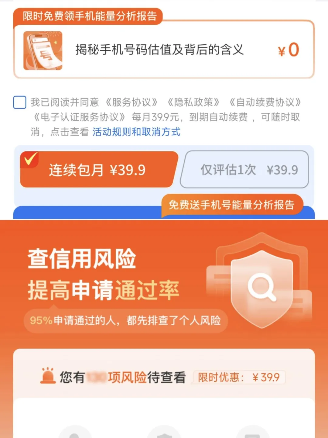 要付多少钱?海南凤凰木科科技有限公司也即天下信用的服务界面显示,该公司评估一次,费用39.9元。但该公司在用户确认同意时,耍起了小心思,不仅在收费栏上面用0元限时免费领手机能量分析报告混淆注意力,还将“仅评估1次”的选项放在了后面,如果用户不仔细看,则很容易被连续包月续费。