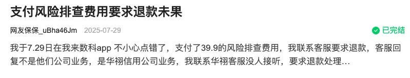 在消费保上,也有用户表示,“我于7月29日在我来数科app不小心点错了,支付了39.9的风险排查费用,我联系客服要求退款,客服回复不是他们公司业务,是华祤信用公司业务,我联系华祤客服没人接听,要求退款处理…”
