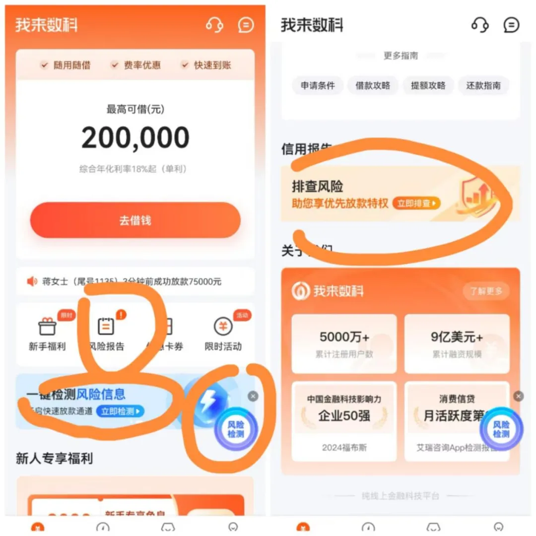 第一处在“去借钱”下方,是一个带叹号“!”的“风险报告”提示;第二处,其下方可滑动的板块,也有“一键检测风险信息,开启快速放款通道”的提示;第三处,进一步往下方滑动,有一个“信用报告”板块,其又提示,“排查风险,助您享优先放款特权-立即排查”;第四处,界面右侧写有“风险检测”的悬浮窗广告。