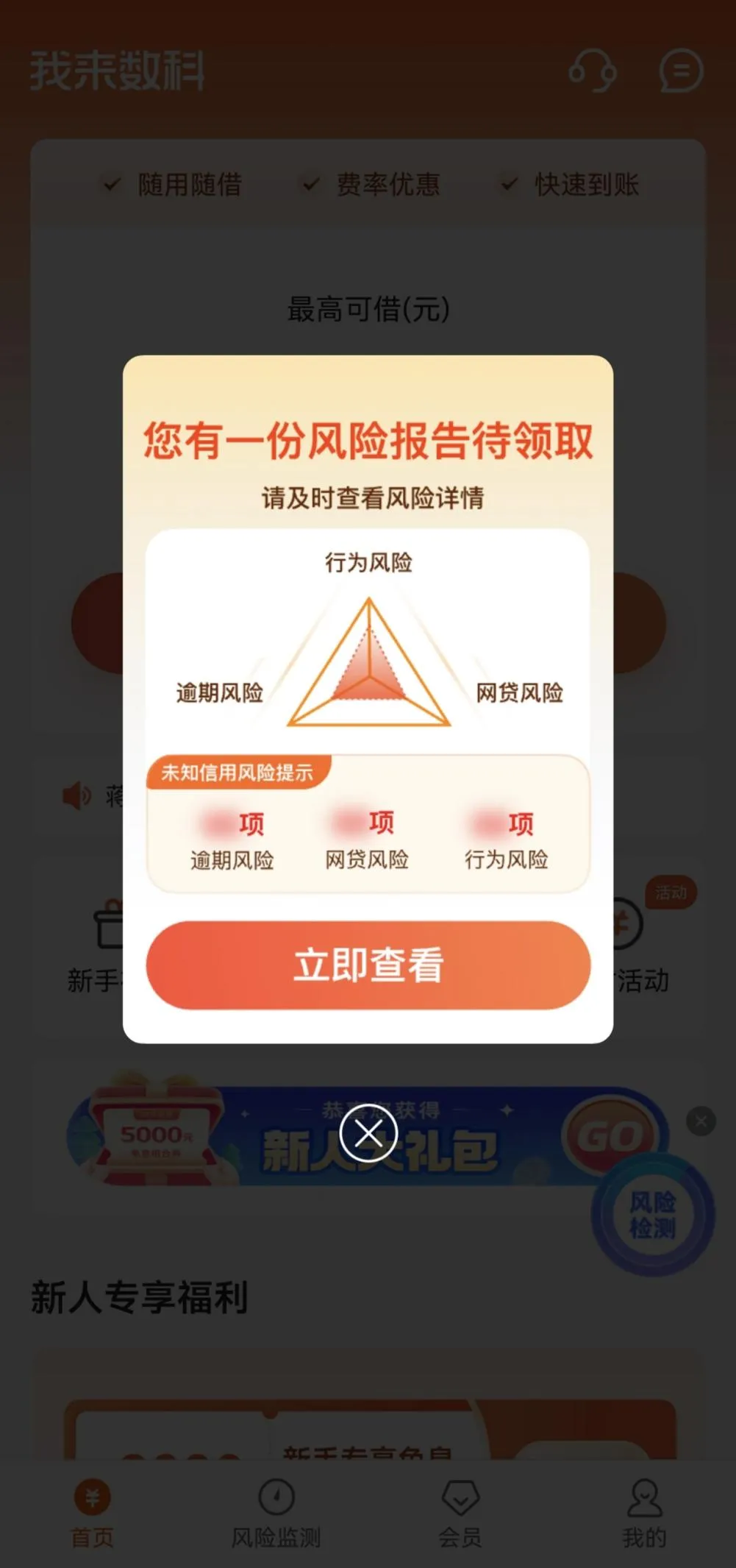 这还没完,在底部的导航栏,还有一个与“首页”“会员”“我的”并列的“风险监测”。