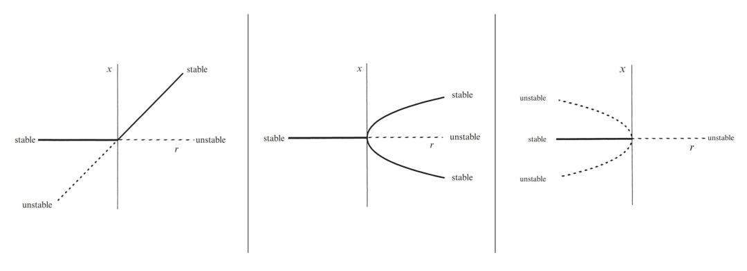图2:从左到右,依次为跨临界分岔图,超临界叉形分岔图,亚临界叉形分岔图。