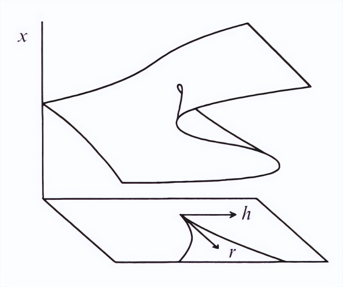 然而,现实世界比这些单参数模型更复杂。如果系统由两个参数控制(即系统的余维数为2),我们会观察到更奇异的行为,比如尖点分岔,如图3所示,这个动力系统的状态在某一区域折成上下两层,从侧面看(投影)就出现分叉曲线。当外部条件(如图中的h)慢慢变化、状态点沿上层走到折边尽头时,它会突然跳到下层,此时就会出现滞后分叉;但如果是固定h,而调节r的话,则会出现我们刚才提到的超临界叉型分叉。尖点分叉很好地将两种不同的分叉统一在一个图像当中,可以用来建模更复杂的突变行为。