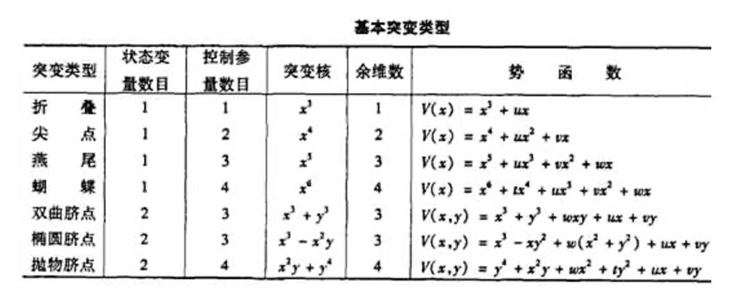 图5:七种基本突变的分类,展示其对应的维数、余维数和势函数