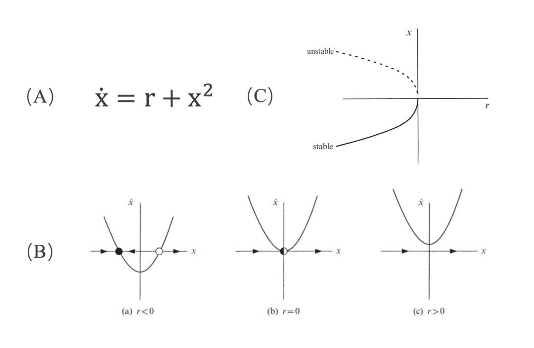 图1:鞍-结点分岔示意图,(A)动力系统的典型微分方程形式,(B)r 变化时分岔的向量场,黑色实心点代表稳定平衡点,空心点代表不稳定平衡点,(C)分岔图
