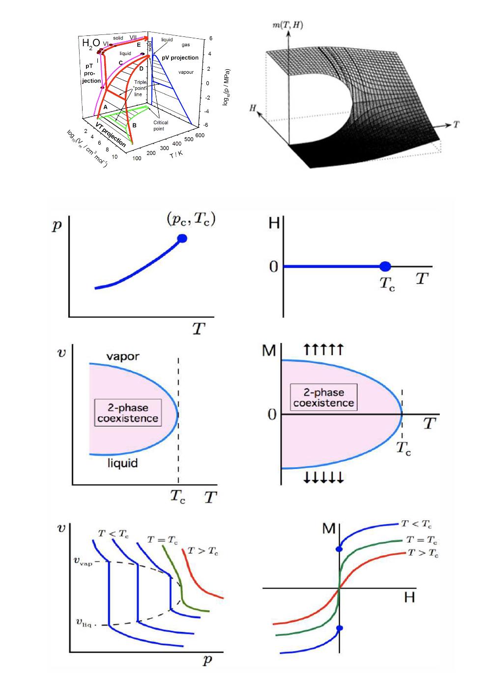 图4:左边为气液相图,右边为伊辛铁磁体相图,最上面两个图分别为水的三维相图和 Ising模型的三维相图,下面六个图为三维相图在不同面上的投影
