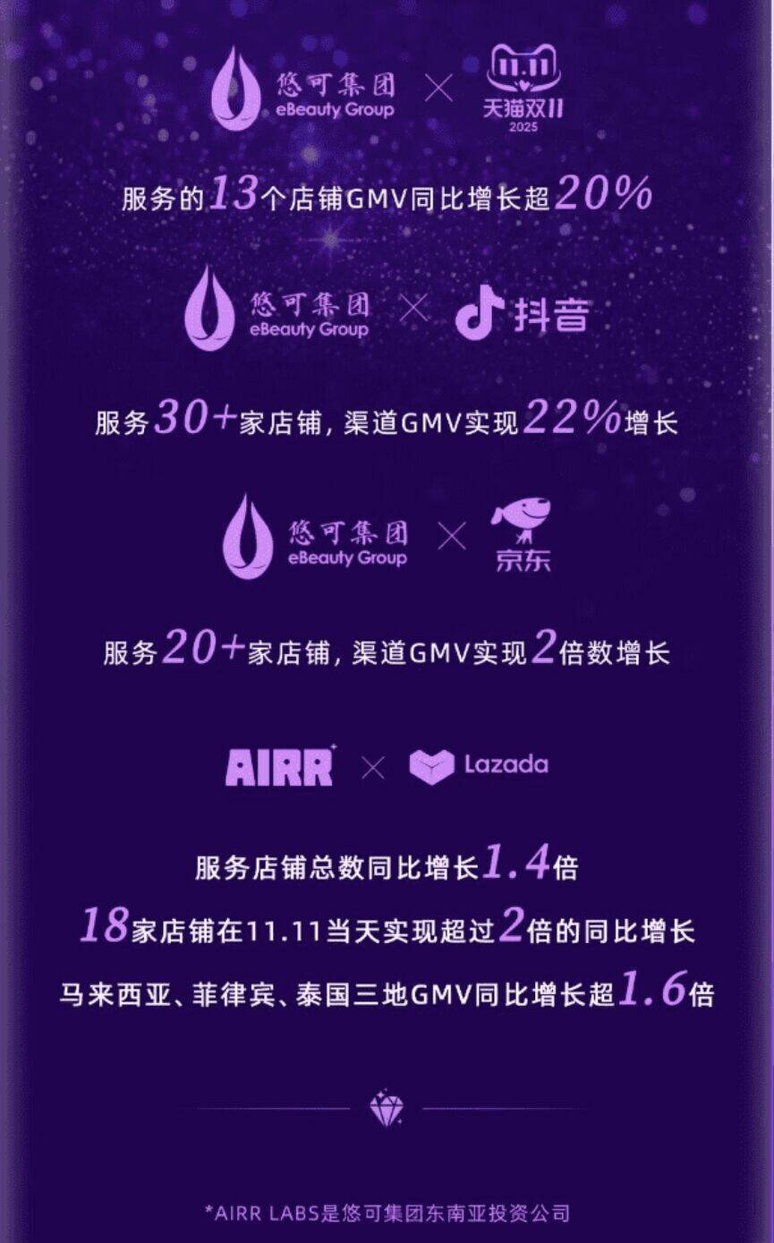11月15日,悠可集团发布2025年双十一战报。2025,悠可集团持续巩固中国与东南亚美妆市场的领先地位,服务触达6个国家20+渠道、150+品牌、300+家店铺,东南亚市场整体GMV同比增长1.6倍。