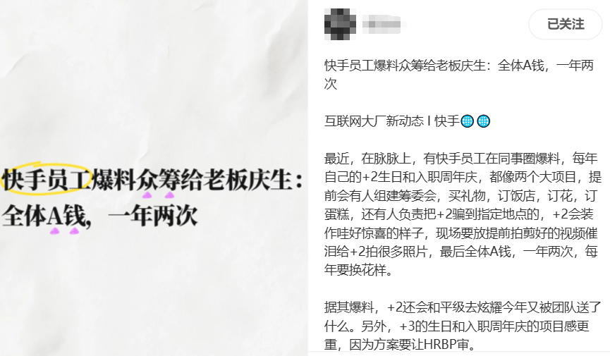 11月18日,有快手员工爆料,团队目前正在筹备公司领导的生日会。