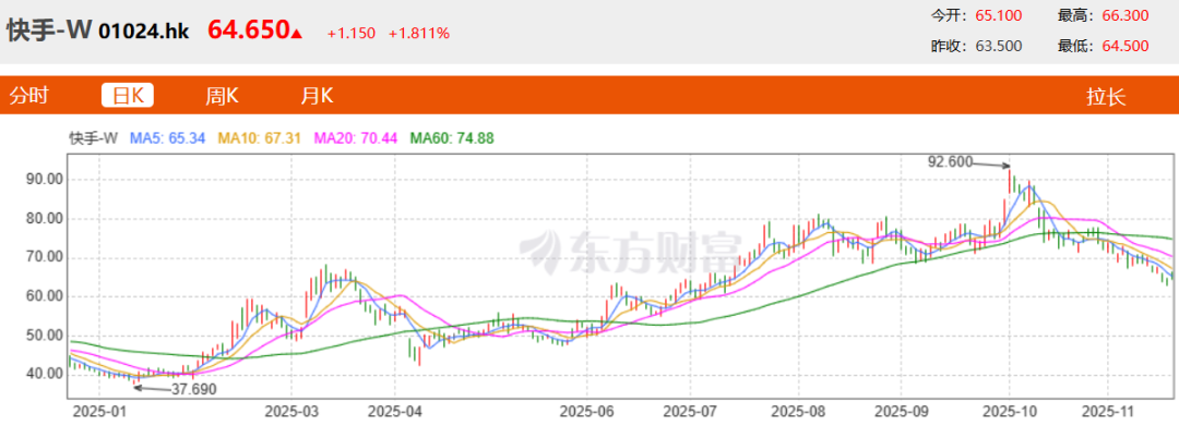 财报后首日,截至中午收市,快手港股股价报64.65港元/股,微涨1.81%。