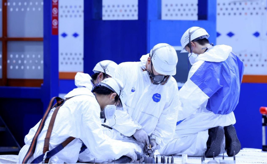 面对中机身数千个铆钉孔的新技术要求,装配工人们克服新材料和特定环境的挑战,拿出硬功夫连续作战,直到前机身座舱段、中机身段和1号油箱段架内工作顺利下架。