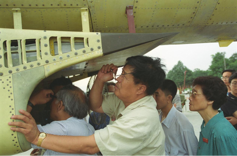 首飞前,歼10飞机现场总指挥杨宝树(左二)在检查进气道