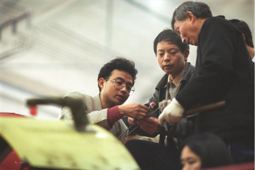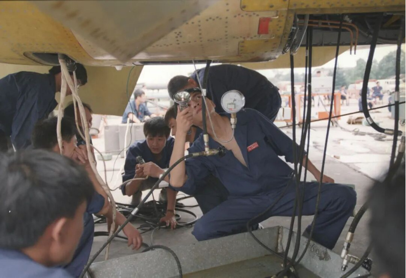 歼10项目机务大队机务张凤贵(右一)在歼-10研制现场