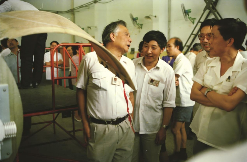 歼10飞机总设计师宋文骢(左一)、时任成飞总经理侯建武(右一)等人在研制现场交流
