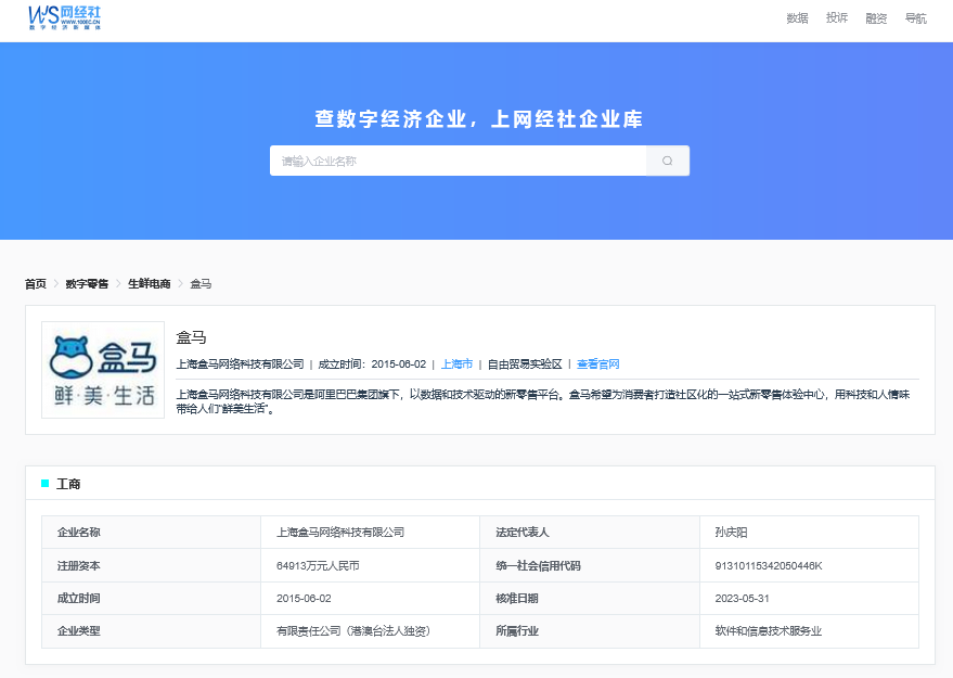 据网经社企业库显示,“盒马”属于上海盒马网络科技有限公司,成立于2015年6月2日,法定代表人为孙庆阳。