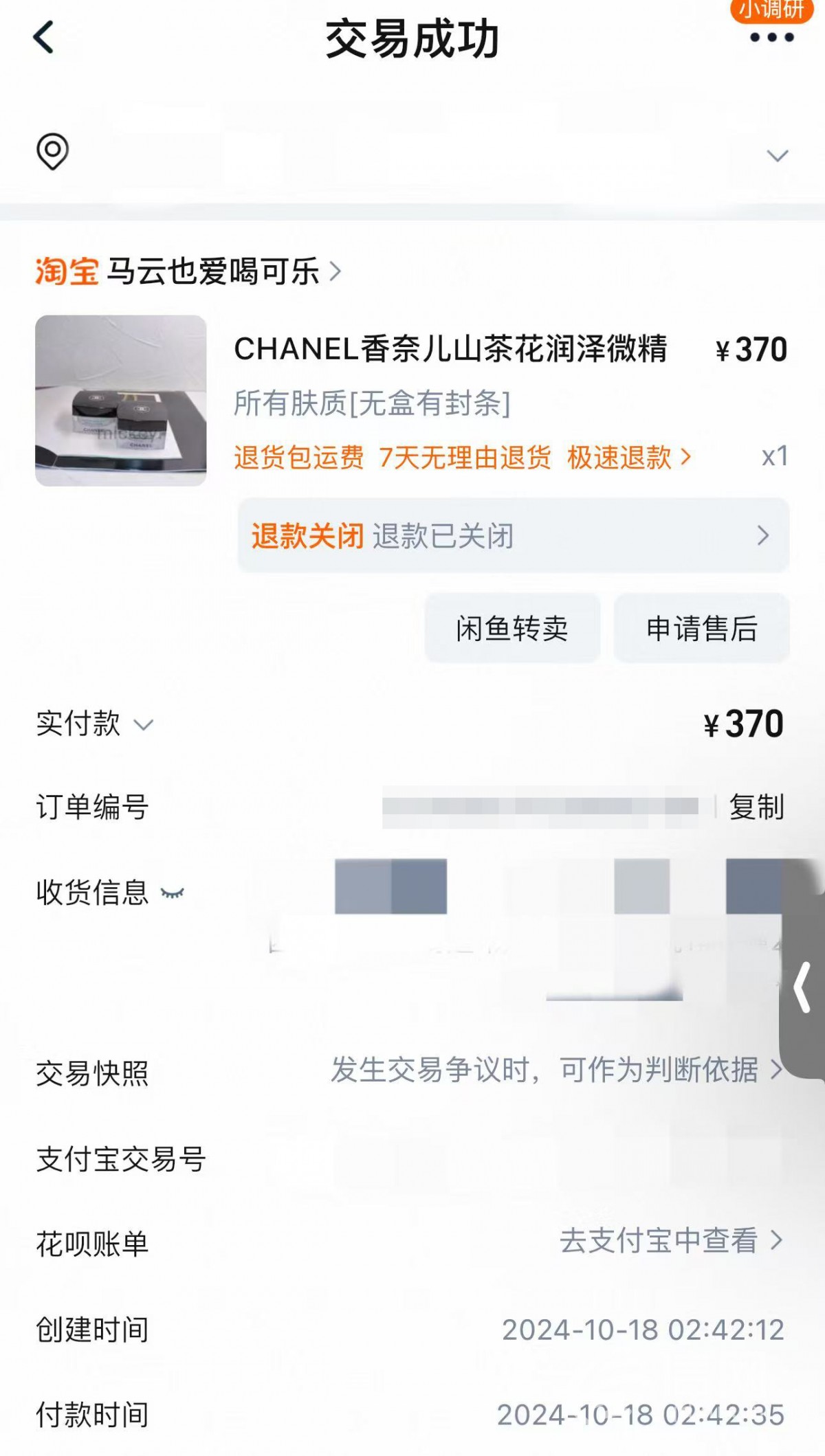 2024年10月,姜女士在淘宝的一家个体工商户店铺“马云也爱喝可乐”花370元买了一瓶“CHANEL香奈儿山茶花润泽微精华乳霜”。收到货后,姜女士感觉这次网购的乳霜跟自己之前用过的有明显差异,而且外包装上没有企业名称等信息,疑似是“三无产品”。