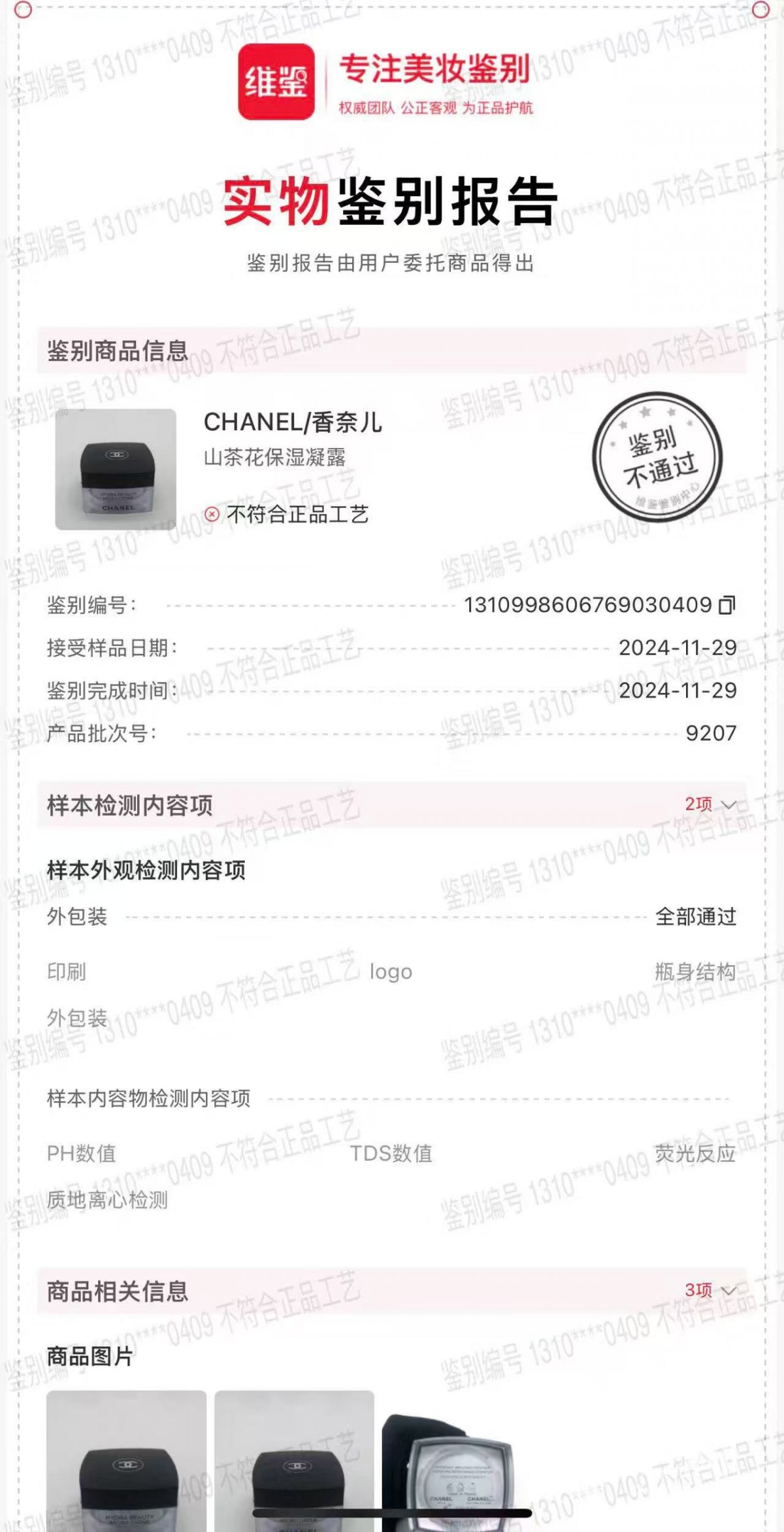 为打消疑虑,姜女士在一款名叫“维鉴”的App上进行了鉴定。据了解,维鉴App的运营方惠州市维鉴检测技术有限公司,已获得广东省市场监督管理局颁发的检验检测机构资质认定证书。根据鉴定结果,“内容物质地实验等技术信息与正品特征不符”,姜女士认定自己买到了假货,要求商家“退一赔三”。