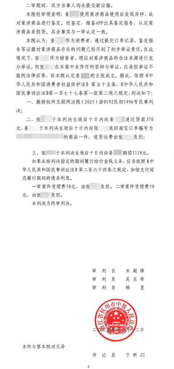 杭州市中级人民法院审理认为,姜女士作为消费者,通过提交订单记录、鉴定报告等证据,已经尽到了初步举证责任。在此情况下,销售者理应对案涉商品的合法来源进行充分举证。但淘宝店铺的经营者未作任何答辩与举证,应承担举证不能的法律后果。2025年11月,杭州市中级人民法院做出终审判决,撤销了杭州互联网法院的判决,判决姜女士退回购买的乳霜,淘宝店铺的经营者则退还货款,并按照货款三倍给予赔偿。
