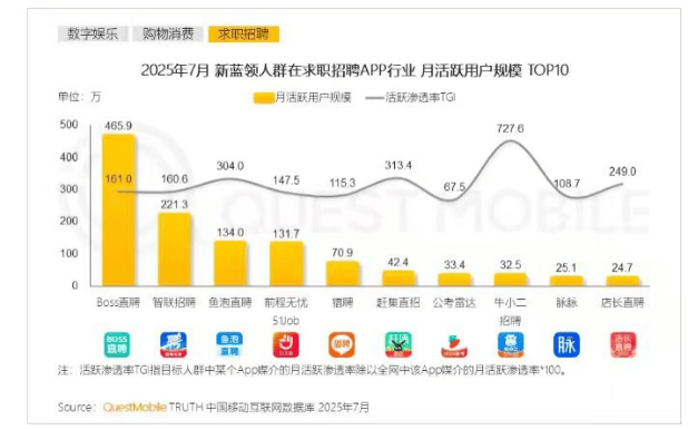 在求职者端,BOSS直聘成为许多新蓝领的优先选择。QuestMobile数据显示,2025年7月,BOSS直聘新蓝领人群月活跃用户规模约为行业第二、三、四名的总和。