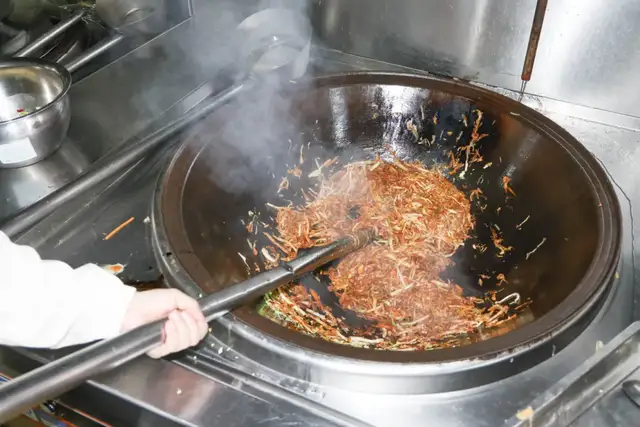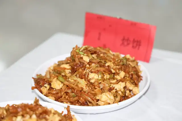 后厨同样热火朝天,配菜工作有条不紊地进行。炒锅里香气四溢,“锅气”十足的炒饼正在火热烹制中:鸡蛋炒饼、肉丝炒饼、豆角炒饼……你最pick哪一款?