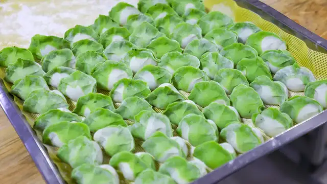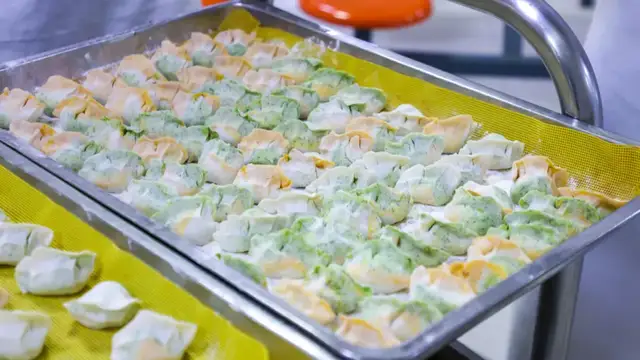 创意不止于此!食堂师傅们将蔬果汁融入饺子皮,打破传统白色外观,摇身变成“翡翠玉饺”,晶莹剔透、娇艳欲滴,光看颜值就让人垂涎欲滴~不仅造型惊艳,包饺子的速度也是快得惊人!小组默契配合,一眨眼功夫,整盘饺子就已包好,效率满分!