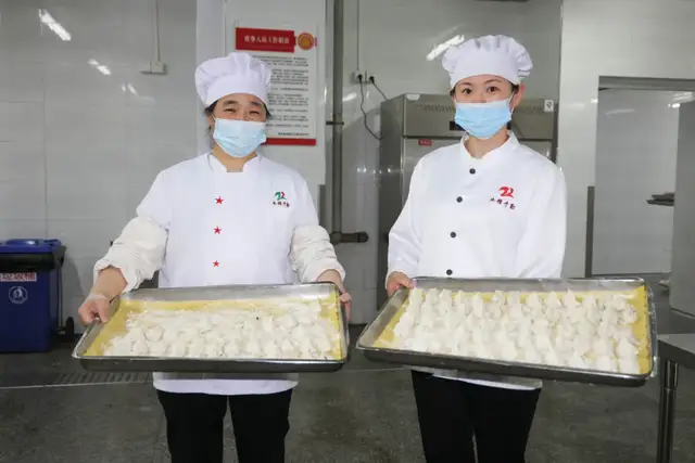 创意不止于此!食堂师傅们将蔬果汁融入饺子皮,打破传统白色外观,摇身变成“翡翠玉饺”,晶莹剔透、娇艳欲滴,光看颜值就让人垂涎欲滴~不仅造型惊艳,包饺子的速度也是快得惊人!小组默契配合,一眨眼功夫,整盘饺子就已包好,效率满分!