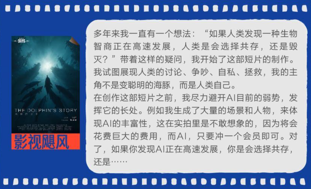影视飓风团队与即梦AI合作的科幻短片**《海豚的故事》**完成度较高,如果海豚基因突变,智慧水平接近人类,会怎么样?资源抢夺、引发战争……