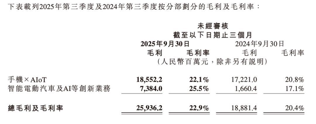 第三季度,小米智能电动汽车的ASP(平均售价)由2024年第三季度的每辆23.86万元上升9.0%至每辆26.01万元。同时,在不打价格战、不以价换量的基调下,该业务毛利率达到25.5%,这在单季度交付超过10万台的数据上,显得尤为可贵。
