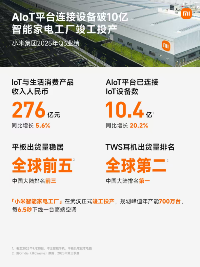 今年10月,小米智能家电工厂在武汉正式竣工投产,完整打通“设计-研发-生产-验证”产业闭环,规划峰值年产能700万台空调,明年将开启空调产品大规模量产,全面支撑小米高端家电的制造与交付。
