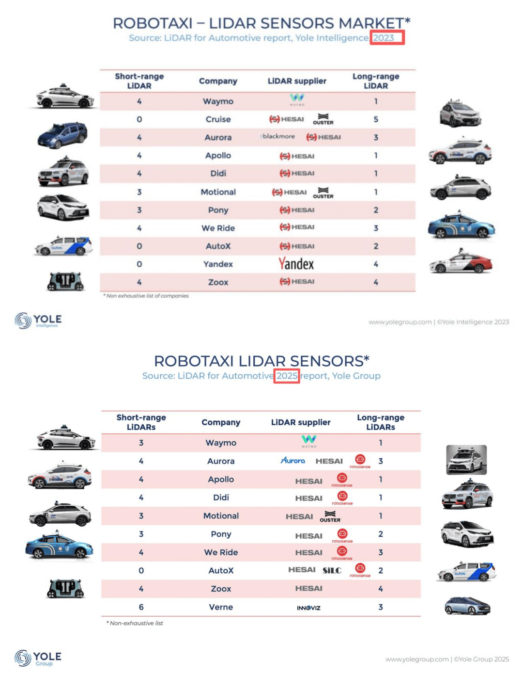 此前,Yole Group连续两年的报告显示,多个Robotaxi出行服务商的激光雷达供应商几乎清一色以禾赛为主。但是到了最新的《2025年全球车载激光雷达市场报告》报告中,在《报告》提及的10家L4自动驾驶公司中,有6家使用的是速腾聚创(RoboSense)激光雷达产品,几乎在禾赛的早期舒适区和其平分秋色。