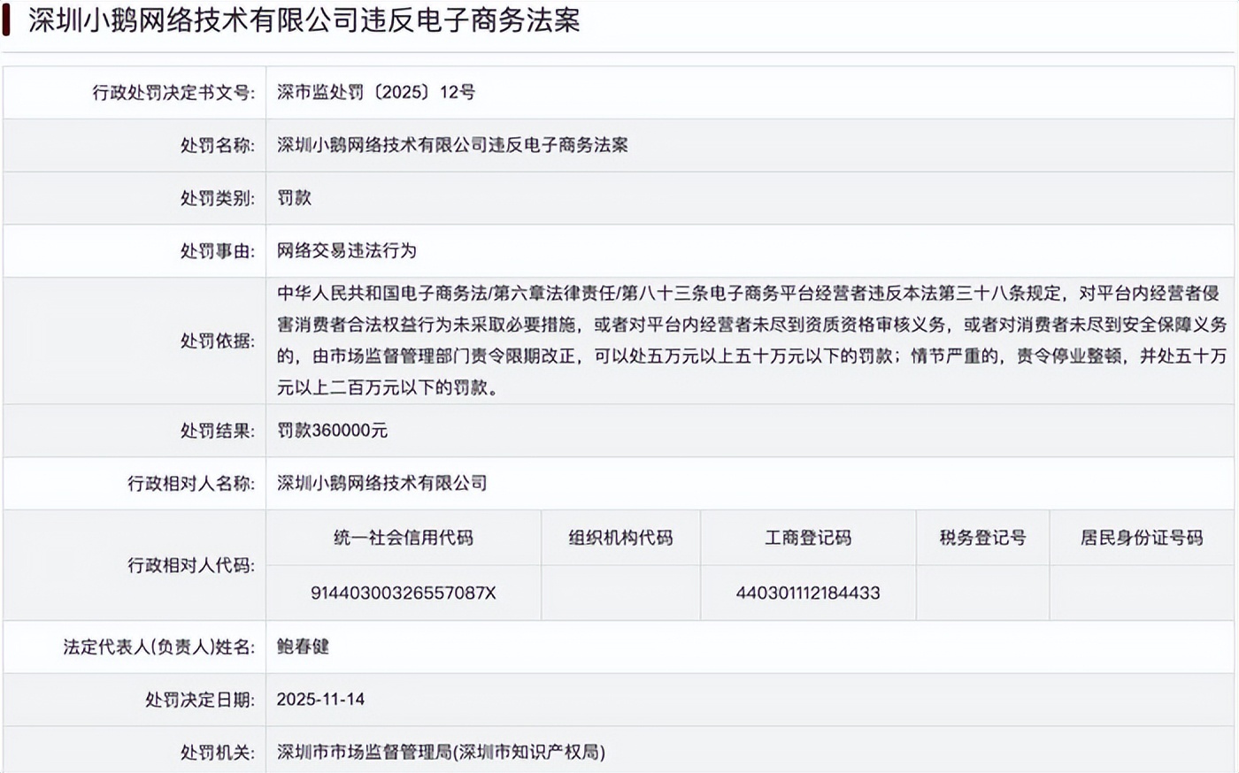 根据行政处罚决定书,深圳小鹅网络技术有限公司在运营过程中,存在网络交易违法行为。此次处罚依据《中华人民共和国电子商务法》第六章第八十三条,该条款明确规定,电子商务平台经营者若未履行对平台内经营者的管理职责,或未尽到对消费者的安全保障义务,将面临处罚。深圳市市场监督管理局对深圳小鹅网络技术有限公司处以罚款36万元的行政处罚。