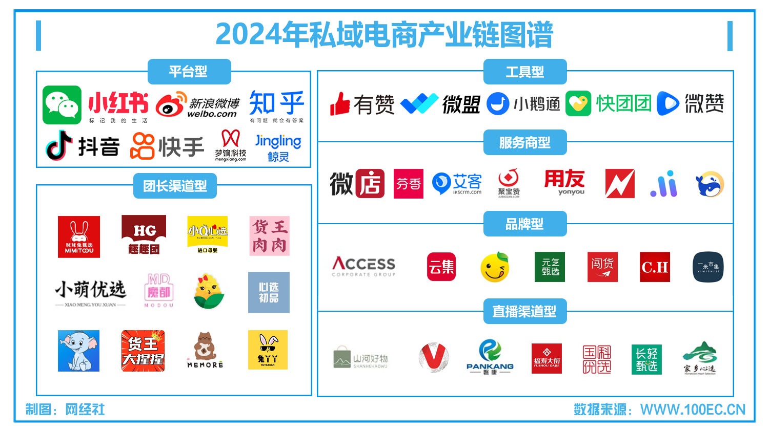 目前私域电商类型有:1、平台型:微信、快手、抖音、小红书、微博、梦饷科技、鲸灵集团、全球家精选、远方好物等;2、品牌型:ACCESS、云集、辰颐物语等;3、直播渠道型:山河好物、小冠优选、品多多、V厨、磐康年华、福寿大街、好易购等;4、团长渠道型:咪咪兔甄选、魔都P妈、海涛优选、灰妈团购等;5、工具型:有赞、微盟、小鹅通、快团团、群接龙等;6、服务商型:微店、芬香、聚宝赞、用友、小裂变、艾客、星云有客等。