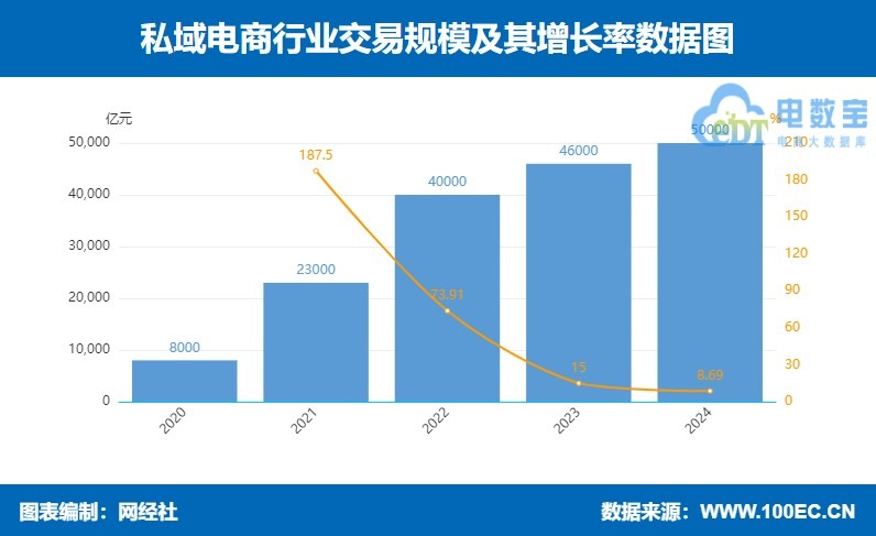 私域电商作为近年来的销售新业态,正处于快速发展阶段。据网经社电子商务研究中心发布的《2024年中国私域电商市场数据报告》显示,2024年私域电商交易规模达到5万亿元,同比增长8.69%。