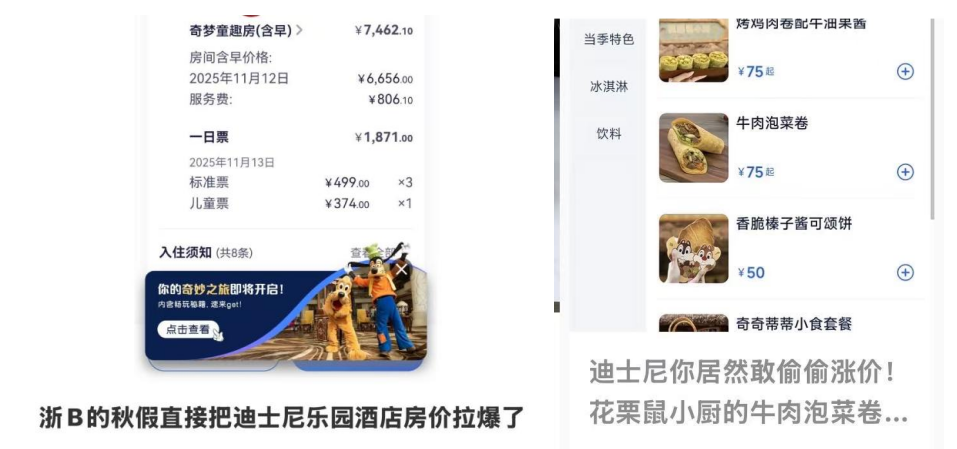 11月12日虽然是一个周三,但也是秋假的第一天,迪士尼的“奇梦童趣房”(含早餐)涨价至7462元,而在11月20日,同款房型的价格则是5714元。11月初时,迪士尼还被发现“偷偷”上调了园区内部分小吃的价格。
