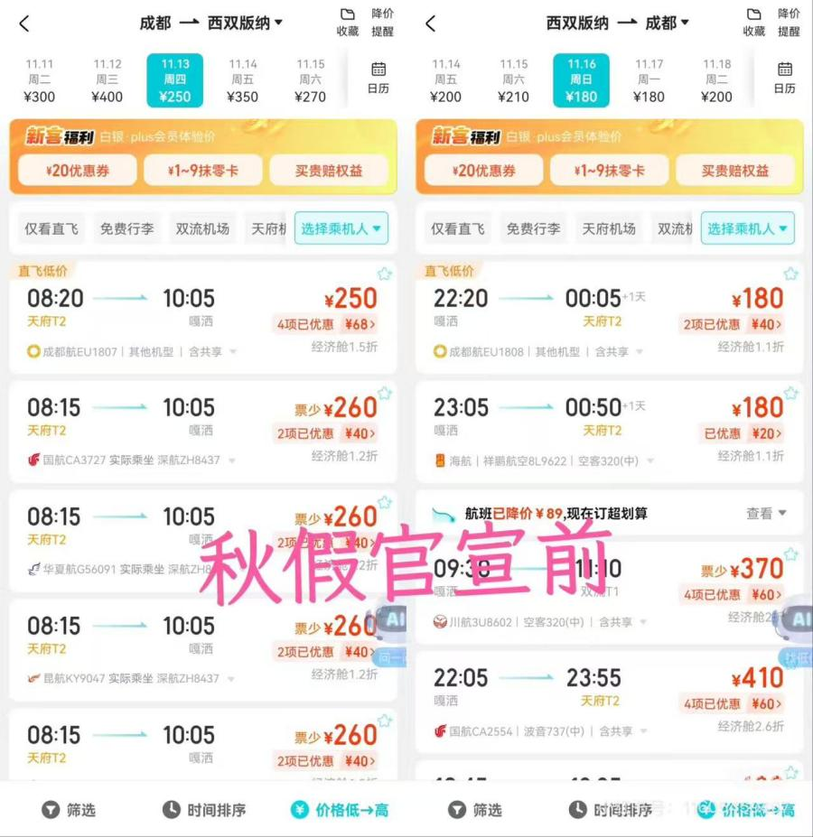 一位家长经过亲身实验发现,成都飞往西双版纳的价格在秋假官宣前后,价格翻了一倍不止。