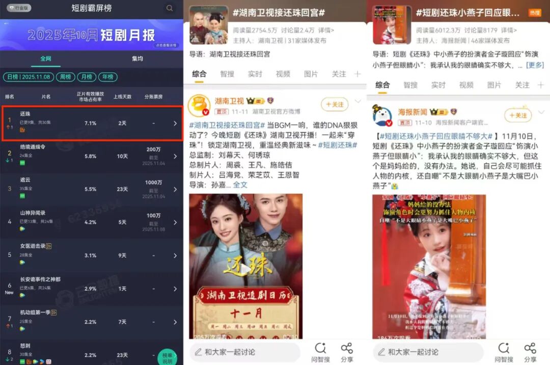 短剧《还珠》创下芒果TV站内播放量、用户规模、会员拉新等多项短剧历史新高,多次登顶云合数据短剧霸屏榜,#湖南卫视接还珠回宫##短剧还珠小燕子回应眼不够大#等话题跑至微博热搜高位,而在社交媒体上,带着要看看这部有多么雷人想法入场的观众也获得了“挺有意思”、“能接受”、“还蛮好看”等意外收获。